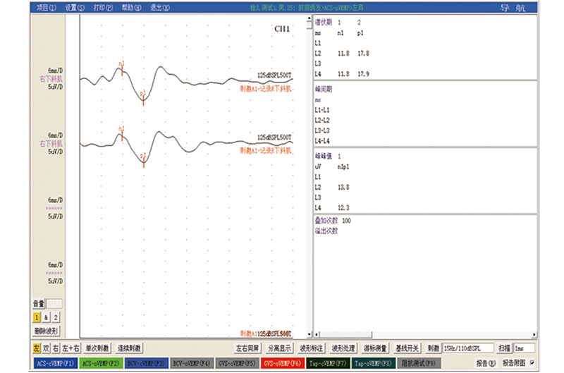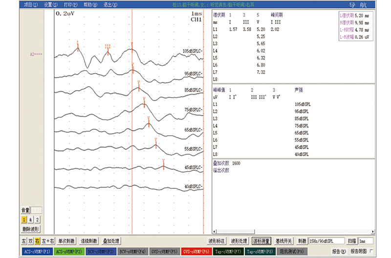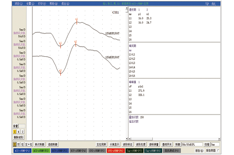 能满足耳鼻喉科临床听力检查技术要求,测试功能主要有:听觉脑干诱发电位,脑干听阈,低频听阈,高频听阈,耳蜗电图,前庭肌源诱发电位测试,听觉事件相关电位等检测项目。其中在耳源性眩晕病检查中前庭肌源诱发电位检查模块对比进口设备提供了更多的检查项目。